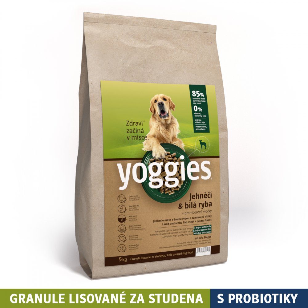 Yoggies s jehněčím a bílou rybou 5 kg + dárek Kostičky masové 10ks