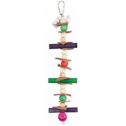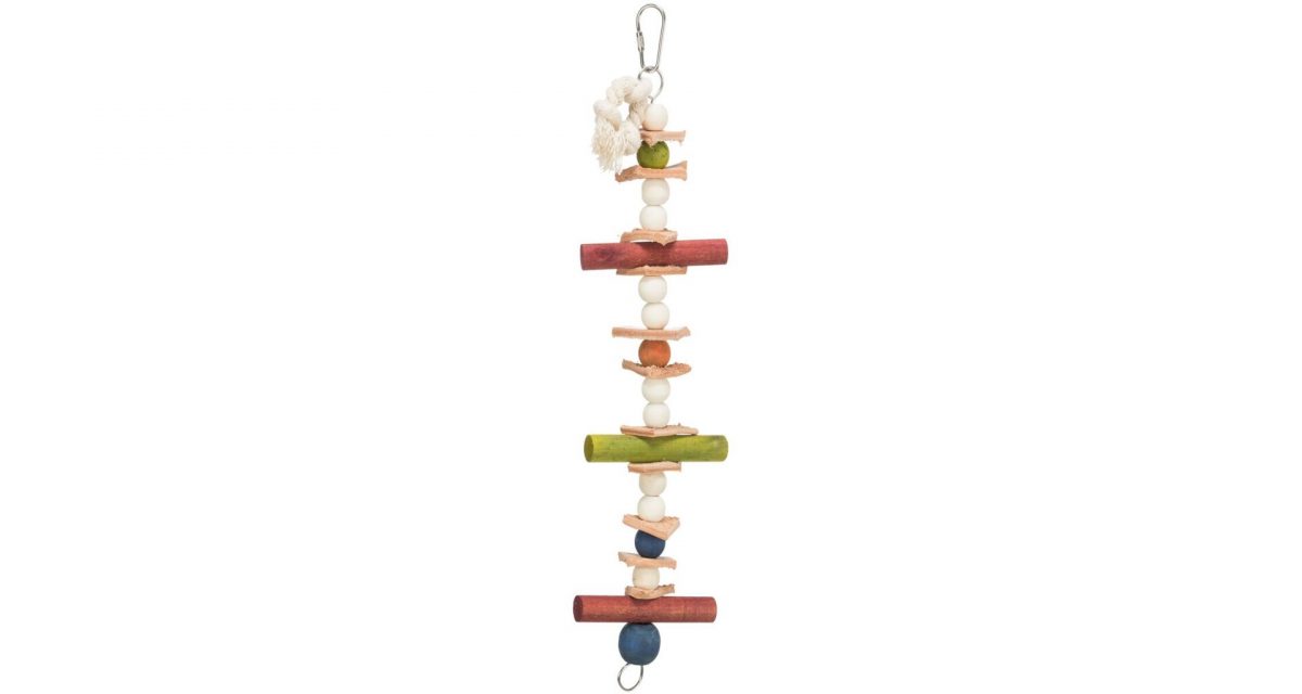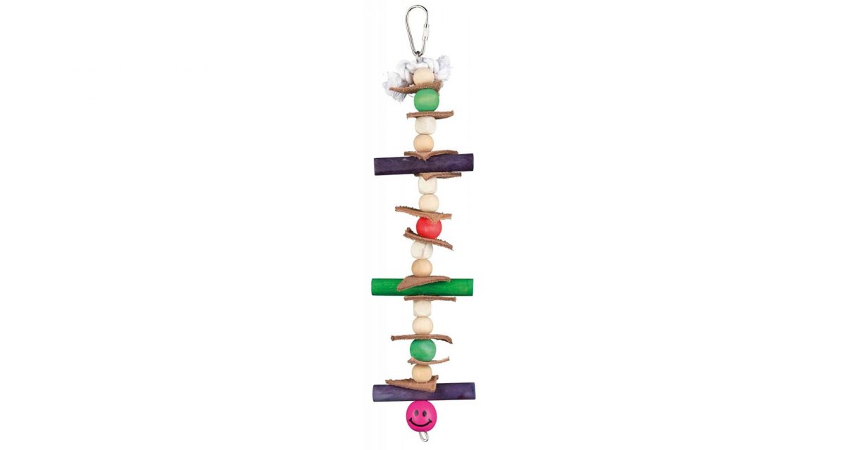 - dřevěné hranoly a kuličky prokládané plátky kůže navlečené na laně - s kovovou karabinou na zavěšení