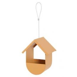 Venkovní kovové krmítko na semínka. Krmítko má stříšku a pevné kovové poutko na zavěšení.