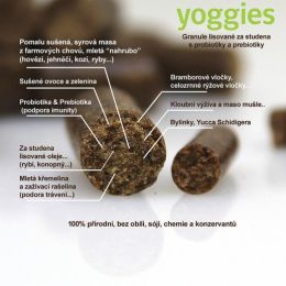 Jako jediné granule tohoto typu na trhu obsahují probiotika (laktobacily), které podporují zdravý imunitní systém a obranyschopnost psa. Receptura granulí Yoggies je sestavena tak, aby měl váš pes požitek z chutí i vůní syrového sušeného masa (obsahují až 87 % kvalitního syrového masa před sušením), tak z chroupání, které napodobuje kousání kostí a vyplavuje endorfiny (hormon štěstí).