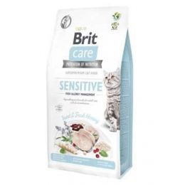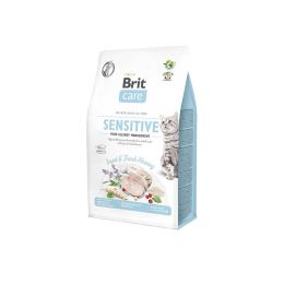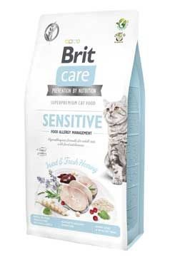 Bezobilné granule pro kočky Brit Care Cat Grain-Free Sensitive jsou speciálně vytvořeny pro pokrytí nutričních potřeb citlivých koček. Krmivo obsahuje tzv. "bílkovinu budoucnosti" (hmyz) a čerstvé maso ze sledě (26 %). Tato proteinová kombinace má úžasnou chuť, a proto krmivem Brit Care Cat GF nepohrdne ani ta nejvybíravější a nejmlsnější kočka. Krmivo s označením Sensitive je doplněno o probiotika a prebiotika, která kočce pomáhají správně trávit a zvyšuje přirozenou obranyschopnost organismu. Receptura je bohatá na Omega-3 a Omega-6 mastné kyseliny. Tyto kyseliny podporují zdraví kůži a lesk srsti. Hmyzí protein podporuje zdravé trávení a snižuje riziko potravinových alergií. Jedná se o nový udržitelný zdroj proteinu s nízkou uhlíkovou stopou. Hypoalergenní složení s rakytníkem řešetlákovým podporuje zdraví ledvin a močových cest.