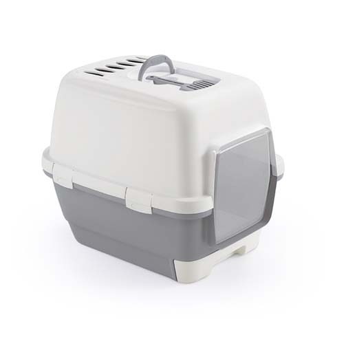 Uzavřené, prostorné wc pro kočky s dvířky z kvalitního odolného plastu. Barva: šedá, bílá