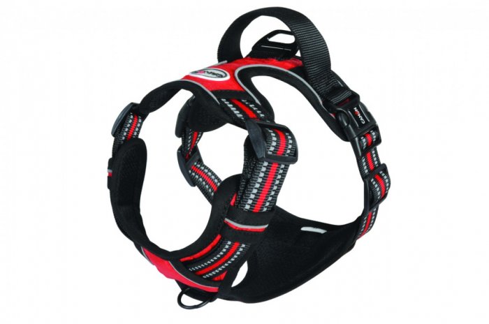 Polstrovaný nastavitelný postroj "Comfort Prime" s odolnou rukojetí a reflexními švy.