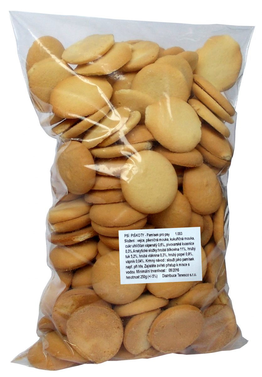 Piškoty - po celá léta nejpoužívanější odměna při výchově, výcviku a práci se psem. Do každé kapsy se jich vejde spousta, dají se dobře dělit na meší části. Podávejte jako pochoutku a zajistěte zvířeti přístup k misce s pitnou vodou. Množství podávané pochoutky nesmí přesáhnout 1/4 běžné denní krmné dávky. Složení: pšeničná mouka, vejce, cukr, kukuřičná mouka, celozrnná pšeničná mouka, uhličitan vápenatý (0,6%), pivovarské kvasnice (0,3%) Analytické složky: hrubý protein 11% hrubé oleje a tuky 5,2% hrubý popel 0,9% hrubá vláknina 0,3% vápník 0,04% Obsahuje přídavek vápníku, ketrý je nezbytný pro stavbu a růst kostí. Uchovejte v chladu a suchu, chraňte před přímým slunečním světlem. Není určeno pro konzumaci lidmi.