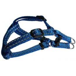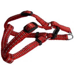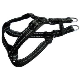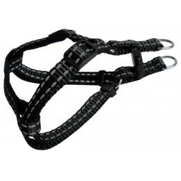Nylonový postroj, velmi pevný, ale měkký a lehký, precizně reflexně prošitý. Pohodlné zapínání pouze na jednu přezku, dva kroužky pro upnutí k vodítku.