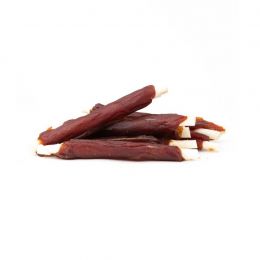 Přírodní masová tyčka z hovězí kůže obtočená plátkem lahodného kachního masa.