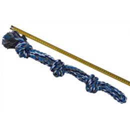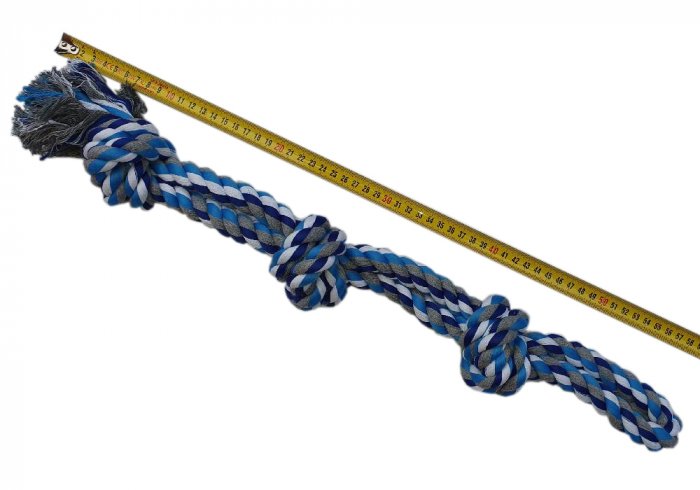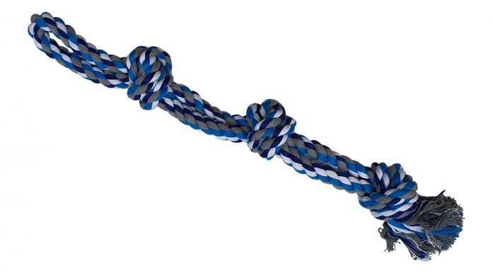 Bavlněný uzel modré barvy je výbornou hračkou pro psa s podporou dentální hygieny.