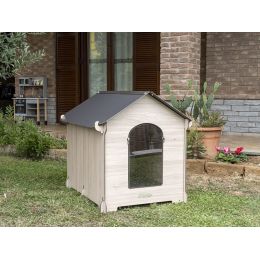 - Vchod psí boudy je chráněn voděodolnými lexanovými dvířky, které Vašeho mazlíčka ochrání před větrem a chladem. Dvířka jsou na dvou místech zaháknuta na vchod a pejsek jimi může pohodlně procházet dovnitř i vně boudy.