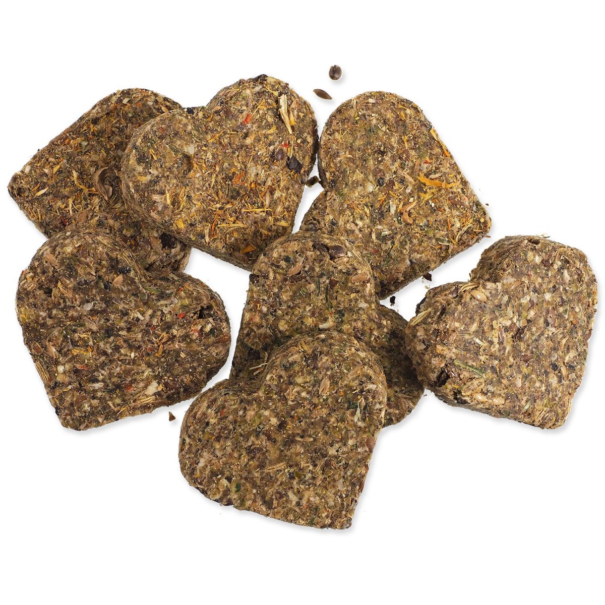 hrachové vločky, řepkový olej, semena kanárských travin, kopřiva, pohanka, semena travin, lněné semeno, semena fenyklu, petržel, mrkev, konopná semena, květy měsíčku lékařského 1,3%, máta peprná 1,2%, pampelišky, semena černého kmínu, hrachový škrob (suroviny v sušeném stavu).