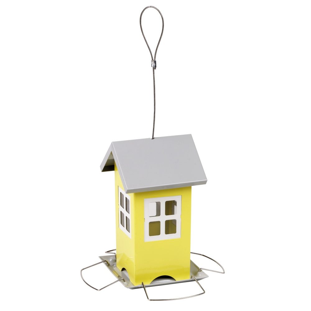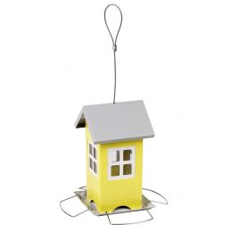 Designové venkovní krmítko ve tvaru domečku. Kovové provedení se zásobníkem.