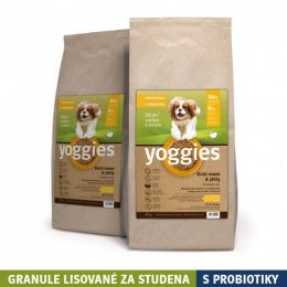 Jako jediné granule tohoto typu na trhu obsahují probiotika (laktobacily), které podporují zdravý imunitní systém a obranyschopnost psa. Receptura granulí Yoggies je sestavena tak, aby měl váš pes požitek z chutí i vůní syrového sušeného masa (obsahují až 87 % kvalitního syrového masa před sušením), tak z chroupání, které napodobuje kousání kostí a vyplavuje endorfiny (hormon štěstí). Chroupání tvrdých granulí také mechanicky čistí chrup psa. Tyto granule jsou lisovány za studena při teplotě max.38 °C bez použití jakékoliv chemie. Jejich receptura je vyvinuta tzv. "All Life Stages" pro štěňata, dospělé i starší psy. VELIKOST GRANULÍ - MINIGRANULE pro štěňata a malá plemena psů.