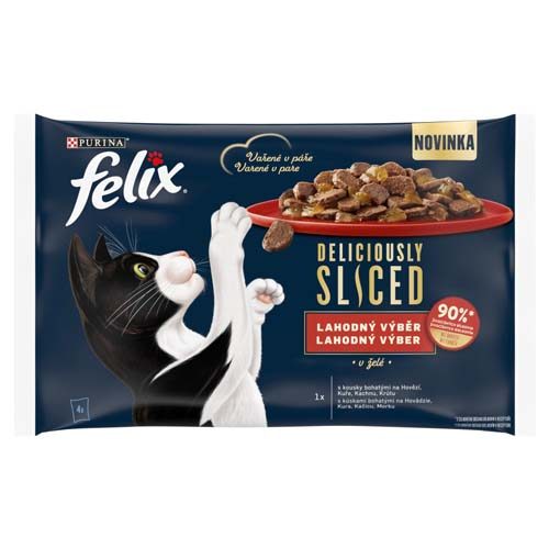 FELIX Deliciously Sliced jsou lahodné plátky pečlivě vařené v páře s vysokým obsahem bílkovin, pokryté chutným želé, které bude vaše kočka milovat! Vypadají, voní a chutnají tak lahodně jako jídlo, které byste si možná sami připravili!