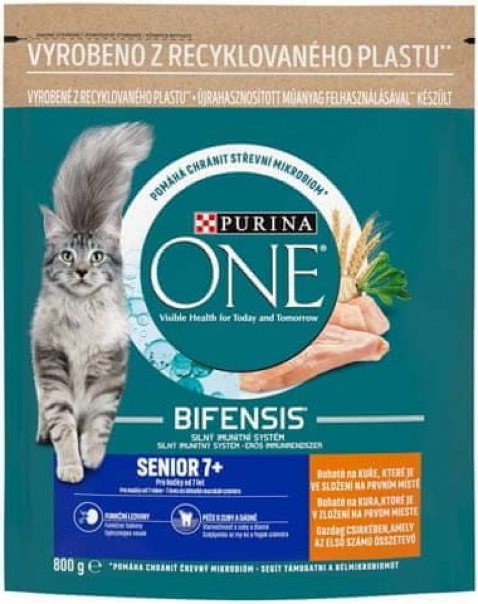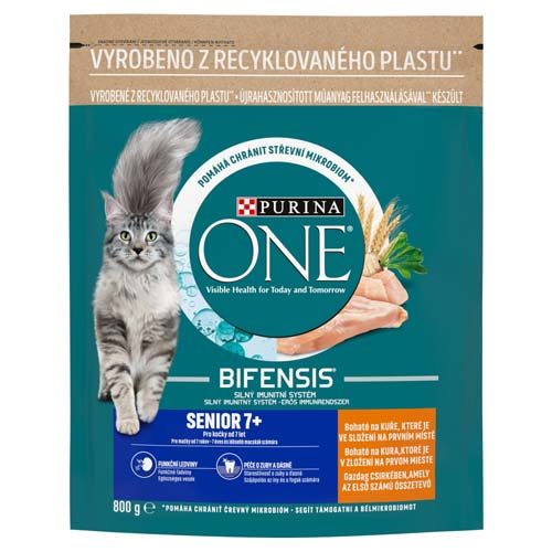 Kompletní krmivo pro kočky od 7 let. PURINA ONE Senior 7+ je nutričně vyvážené krmivo pro kočky starších 7 let. PURINA ONE BIFENSIS® je nutričně jedinečná receptura s prospěšnými bakteriemi, u kterých je vědecky prokázáno, že posilují přirozenou obranyschopnost vaší kočky uvnitř i navenek. Vyvinuto veterináři a experty na výživu společnosti Purina. Krmivo PURINA ONE BIFENSIS® obsahuje prospěšné bakterie a všechny klíčové živiny, které vaše kočka potřebuje, včetně omega-6 mastných kyselin. Receptura s dvojím ochranným účinkem funguje uvnitř těla, tím že pomáhá podporovat přirozenou tvorbu protilátek vaší kočky, a zároveň podporuje vnější ochranu těla, kde udržuje hladkou kůži a srst. Bez přidaných barviv a umělých konzervantů.