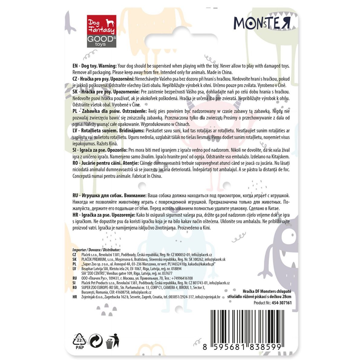 Hračka DOG FANTASY Monsters chlupaté strašidlo růžové pískací s dečkou
