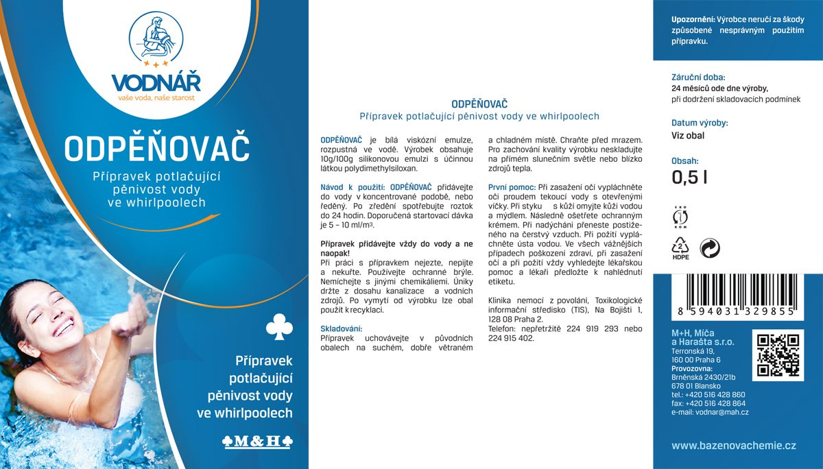 Odpěnovač je bílá, viskózní emulze rozpustná ve vodě potlačující pěnivost vody ve formě roztoku pro ošetření vody ve whirlpoolech a bazénech. Když vám bazén pění, tento přípravek zabraňuje opětovnému pěnění bazénové vody.