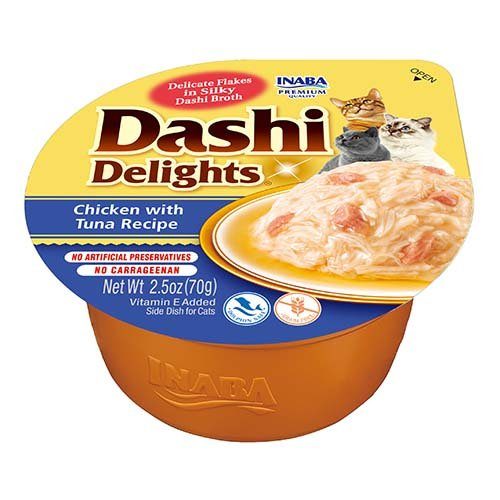 Každý produkt Inaba je vyroben z lahodných vysoce kvalitních surovin, včetně kuřete chovaného na farmě nebo přírodního tuňáka uloveného ve volné přírodě. Vyrobeno z jemného vývaru vyrobeného ze sušeného divoce uloveného tuňáka (bonito vločky), smíchaného s kousky pečlivě vybraných prémiových proteinů, uvolňující novou úroveň chuti pro vaši kočku. Doplňte své krmivo pro kočky s hydratačním krmivem pro kočky, které je bez obilnin, bez konzervantů, bez karagenanu a bez umělých barviv. Čerstvé ingredience s přidaným vitamínem E pro podporu jejich imunitního systému a extrakt ze zeleného čaje jako přírodní antioxidant.