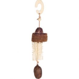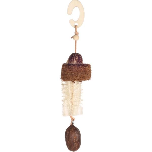 Je vhodná i k okusování – hlodavým mazlíčkům napomáhá v obrušování zubů. Na koženém provázku jsou navěšeny různé prvky z kokosového vlákna a lufy, dřevěný korálek a ořechy. Hračku snadno připnete ke kleci pomocí dřevěného háčku.