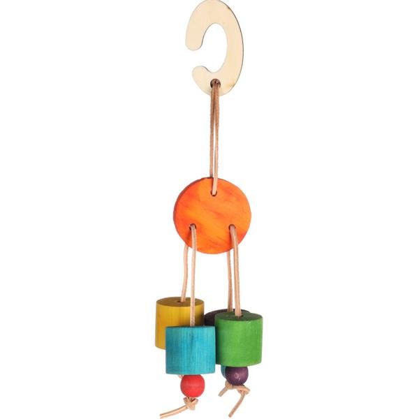 Je vhodná i k okusování – hlodavým mazlíčkům napomáhá v obrušování zubů. Na kožených provázcích jsou navěšeny rozmanité různobarevné tvary ze dřeva (korálky, válečky, kolečko). Hračku snadno připnete ke kleci pomocí dřevěného háčku. Obsahuje zdravotně nezávadné barvy.