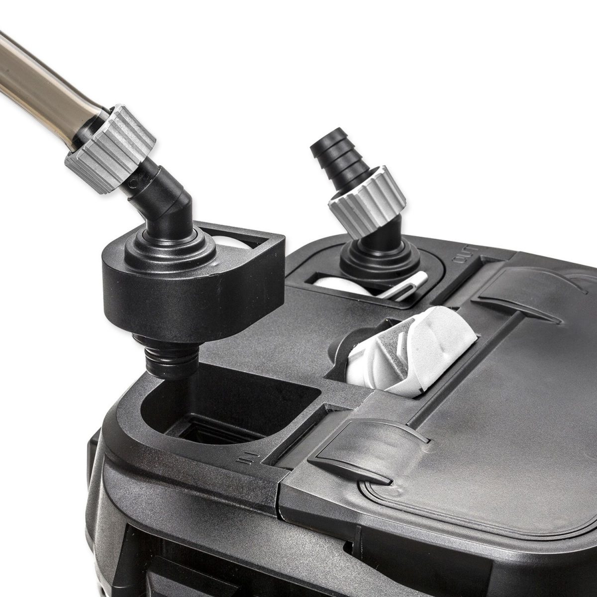 Ovládání výkonu filtru je mimořádně jednoduché a intuitivní. Provádí se otáčením malé páčky na pravém ventilu. Její použití je pohodlné a přehledně označené, takže nastavení výkonu je pro akvaristy snadné, i když to dělají poprvé.