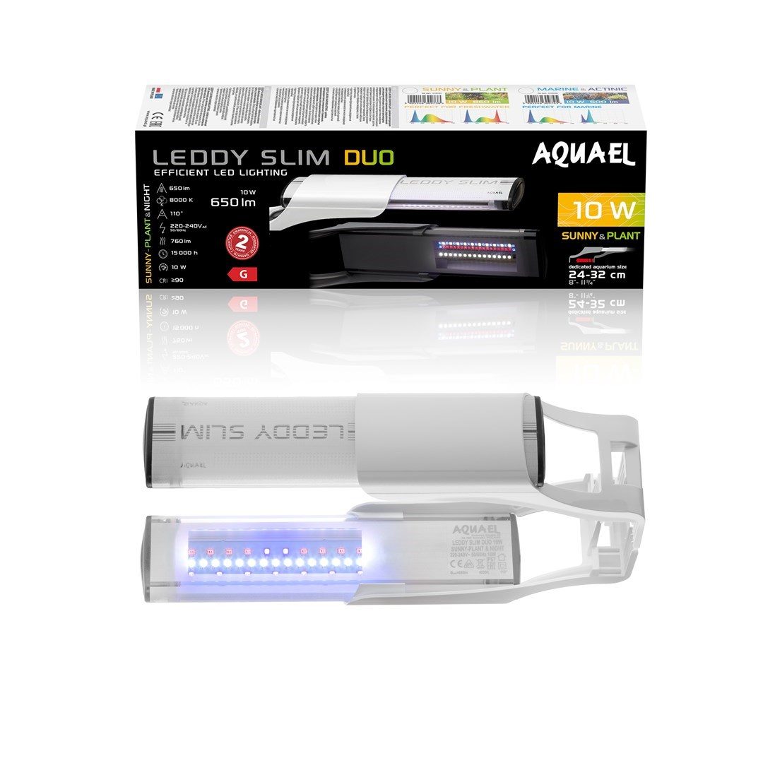 LEDDY SLIM DUO 10W SUNNY PLANT&NIGHT led lampa je určena k osvětlení sladkovodních otevřených nádrží o délce 20 až 30 cm. Obsahuje dvě řady LED diod s celkovým výkonem 10 W (2x5 W).