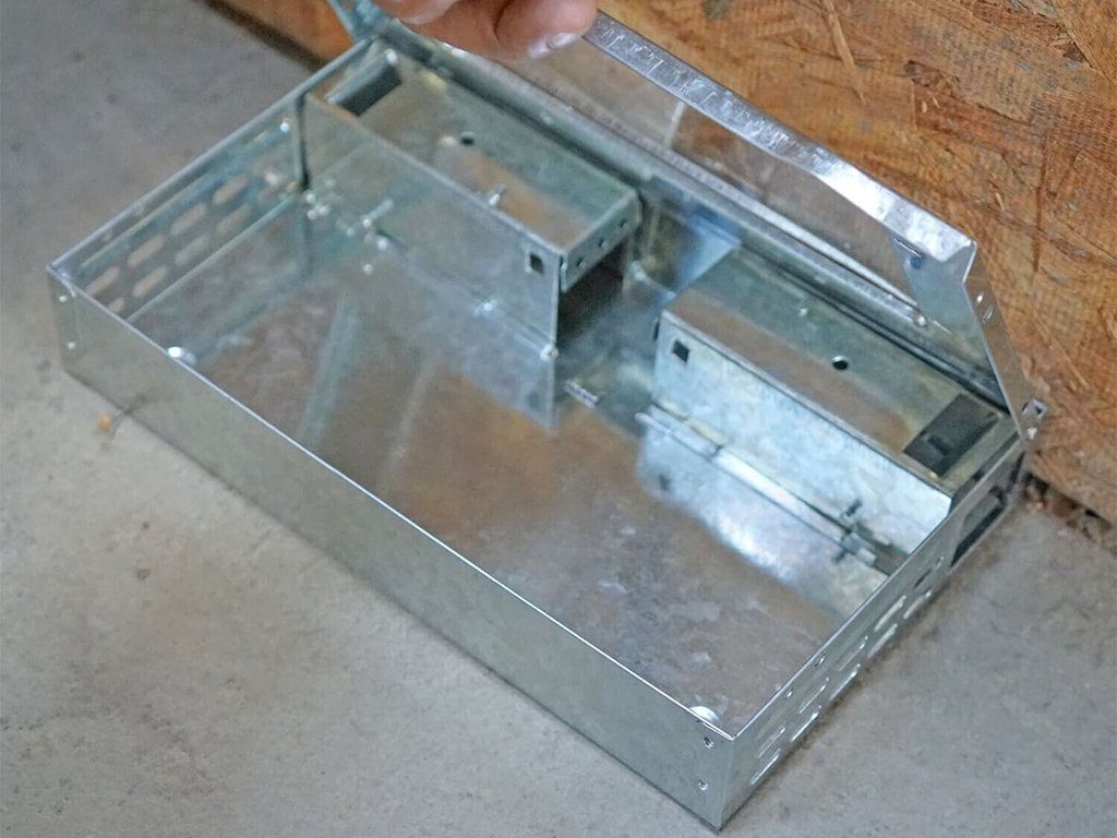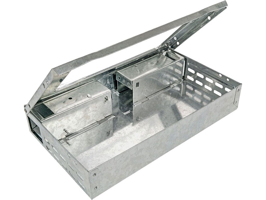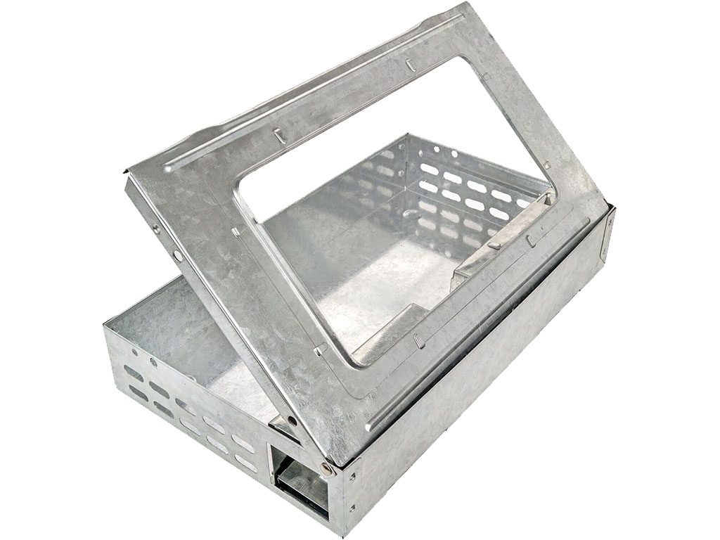 - Jedná se plechovou past s průhledným vyklápěcím víkem.