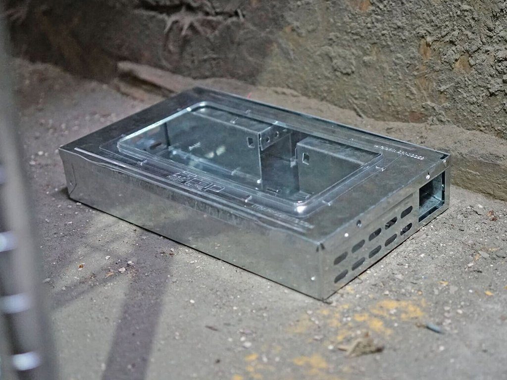 - Jakmile máte připravenou past na potřebném místě, umístěte nástrahu. Nejprve otevřete výklopné průhledné víko a následně umístěte na volnou plochu uvnitř pasti návnadu (například chléb, špek, salám).