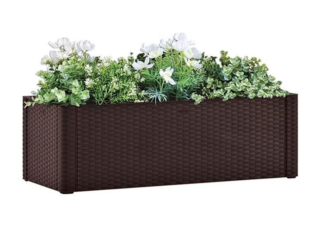 Samozavlažovací truhlík, pro vnitřní i venkovní použití, s ukazatelem hladiny vody, z polypropylenu, barva moka, o objemu 90l, rozměry 100x43x33cm.