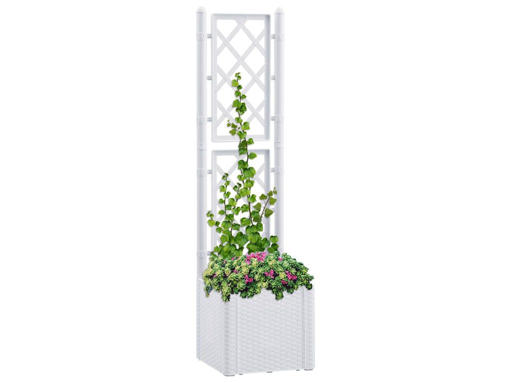 Samozavlažovací truhlík s mřížkou, pro vnitřní i venkovní použití, s ukazatelem hladiny vody, z polypropylenu, barva bílá, o objemu 35l, rozměry 43x43x142cm.