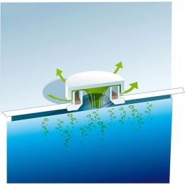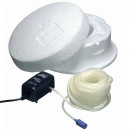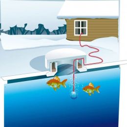 Sada dvoudílného plováku se vzduchovacím kompresorem o výkonu 100 l/h proti tvorbě ledu a zamrzání jezírka. Plovák se vzduchovaním zaručí, že hladina vody jezírka nezamrzne do teploty až -15 °C a usnadní tak všem obyvatelům jezírka přezimování.