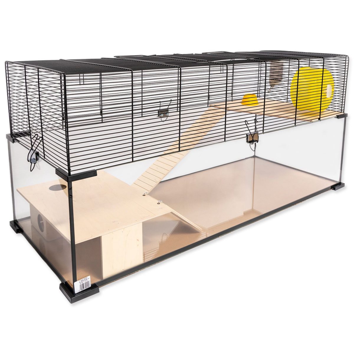 Klec má 2 x menší boční dvířka a 1 x dvířka z vrchu