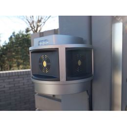 Prostorový ultrazvukový odpuzovač kun a hlodavců, 3000m2, rozsah 270°, 3x LED, 3 piezoelektrické reproduktory, 12V adaptér. Pokud hledáte výkonnou plašičku kun, myší, potkanů a jiných hlodavců s velkým úhlem plašení, máme pro vás perfektní tip. Toto zařízení vydává měnící se ultrazvukový tón ve velkém úhlu až 270°, také stroboskopicky bliká LED světly a pokryje tím velký prostor, z kterého odplaší škůdce. LED světla se spouští po zaznamenání pohybu a mají frekvenci 5 záblesků za sekundu. Ultrazvuk i záblesky světla mají své vypínače a tak je podle potřeby můžete různě kombinovat. Odpuzovač má velice odolný vodotěsný, prachotěsný a UV odolný kryt s označením IP44, díky kterému ho můžete používat jak ve vnitřních, tak i venkovních prostorech. Prostřednictvím unikátního držáku s neodymovým magnetem můžete plašič uchytit téměř na každý povrch. Ultrazvukové signály jsou pro člověka, psy i kočky naprosto bezpečné, zařízení také neruší provoz rádií a elektronických zařízení.