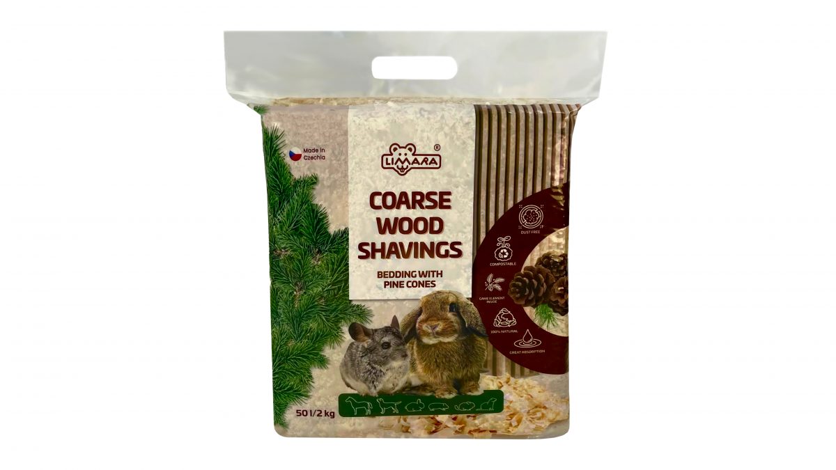 Hrubá hoblinová podestýlka určená pro zajícovce, hlodavce, koně, psy, vybraná terarijní zvířata a ptactvo s přidanými šiškami, jakožto herními prvky vhodnými i k okusu.