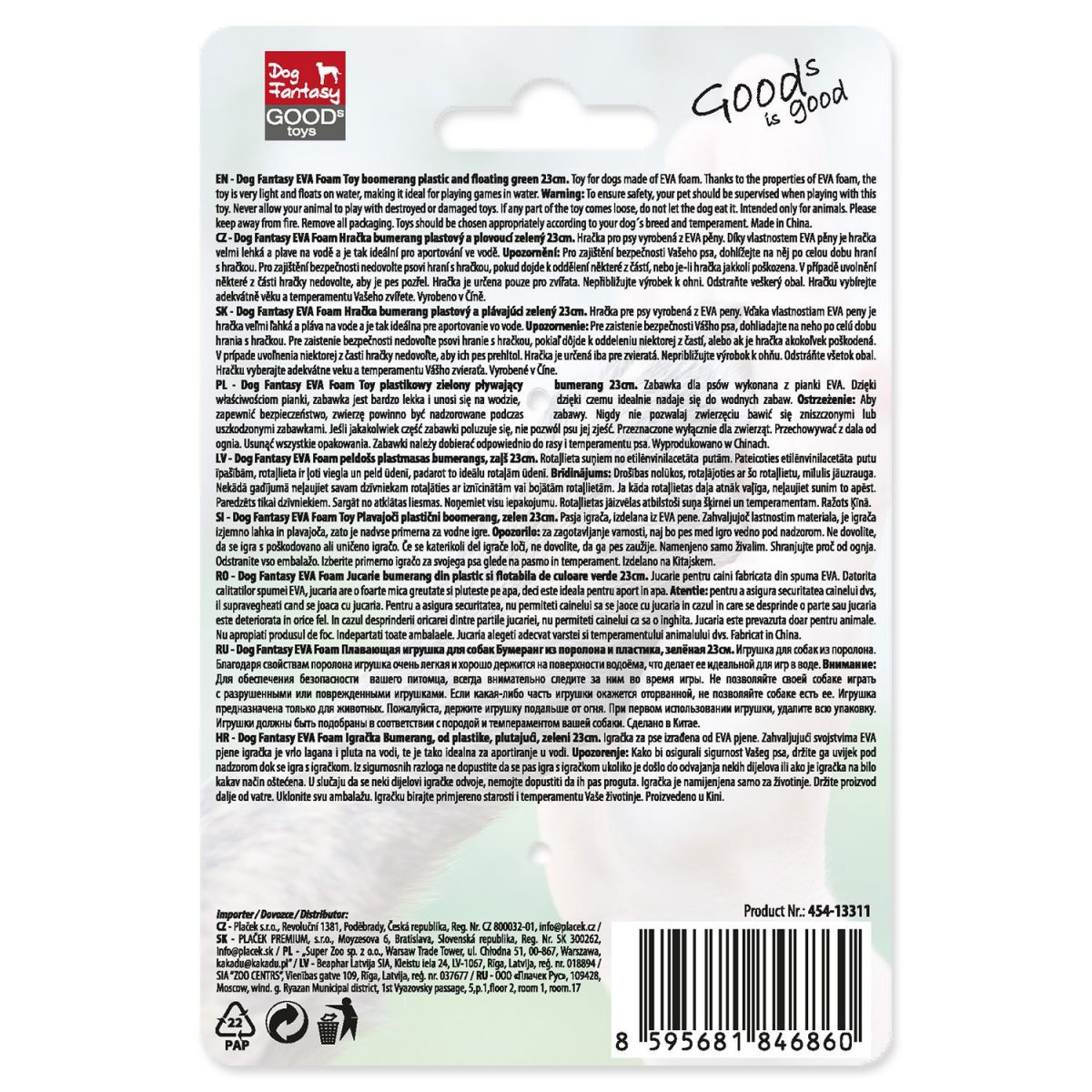 Díky vlastnostem EVA pěny je hračka velmi lehká. Plave na vodě a je tak ideální pro aportování ve vodě.