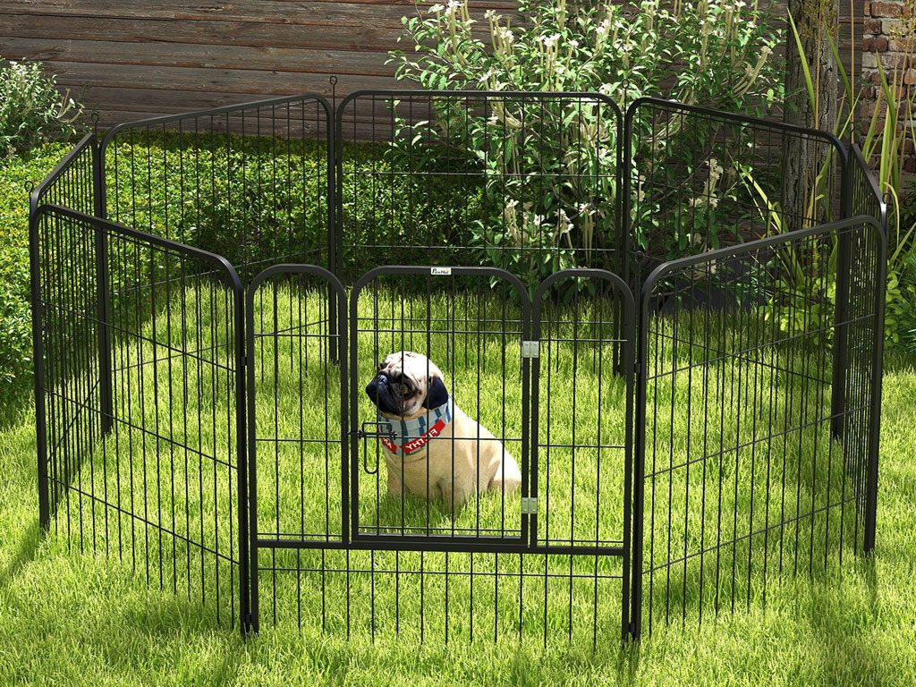Ohrádka pro štěňata a další zvířata, pro vnitřní i venkovní využití, vyvýšená uzamykatelná dvířka, stabilní robustní konstrukce, snadná montáž a demontáž, 8 mřížových panelů o rozměrech 79x79 cm.