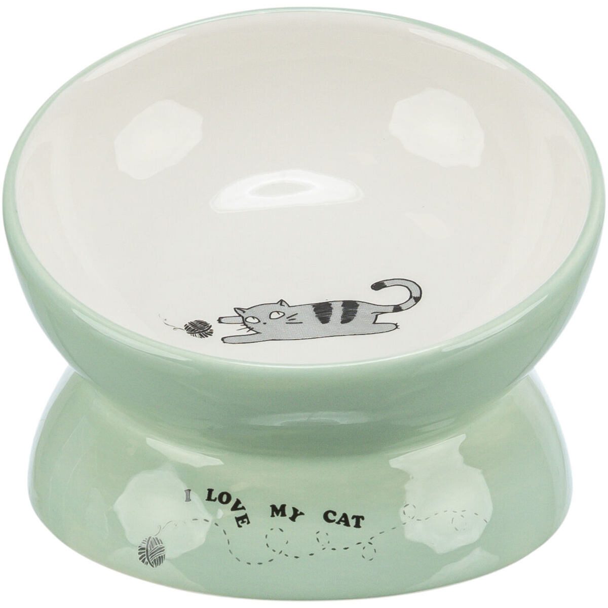 Keramická miska vyvýšená s motivem kočky, ergonomický tvar, 0,15 l / 13 cm, šalvěj/bílá. Barva: bílá, Materiál: Keramika