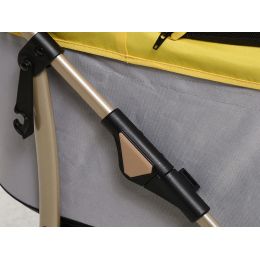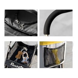Se 4stupňovou sklápěcí střechou lze psa v kočárku snadno uzavřít a díky síťované přední a zadní straně stříšky má pes nejenom dobrý výhled, ale také přísun čerstvého vzduchu. Stříšku jednoduše zajistíte zapínáním, aby pes nemohl vyskočit a navíc psa můžete připnout na dvě bezpečnostní vodítka uvnitř kočárku. Polstrované dno kočárku nabízí psovi pohodlné ležení během jízdy. Během ležení může pes pozorovat okolí přes síťovaná přední dvířka na zip, která lze otevřít. Kočárek má také dostatek úložného prostoru na výbavu pro psa. Spodní velká kapsa pod korbou kočárku slouží k uložení větších potřeb jako je láhev s vodou, vodítko, deka a další potřeby pro psy.