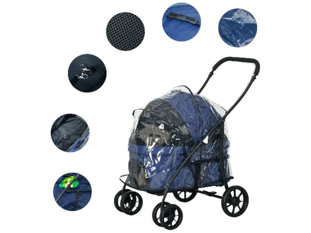 Kočárek 2v1 pro psy do 10kg, také jako přenosná taška, s pláštěnkou do deště, ocelový rám, potah z tkaniny Oxford, přední a zadní síťovaná okénka, skládací 6 stupňová stříška, síťovaná přední a zadní dvířka na zip, pohodlný polštář k ležení, uvnitř koše 2 bezpečnostní vodítka, 2 dvojitá otáčecí přední kola EVA, 2 pevná zadní kola s brzdou, rozměry koše s baldachýnem 61x35x58cm, celkové rozměry kočárku 81x68x98,5cm.