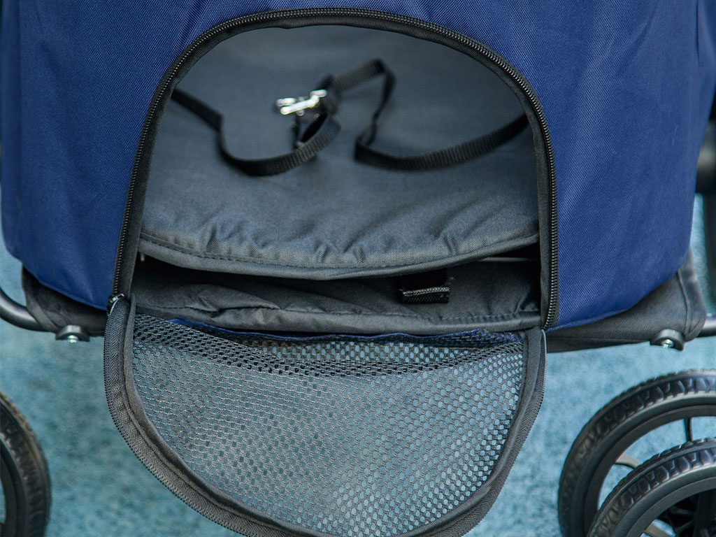 Se 6stupňovou sklápěcí střechou na zip lze psa v kočárku snadno uzavřít a díky síťované přední a zadní straně stříšky má pes nejenom dobrý výhled, ale také přísun čerstvého vzduchu. Psa můžete uvnitř připnout na dvě bezpečnostní vodítka uvnitř kočárku. Měkký polštář na dně kočárku nabízí psovi pohodlné ležení během jízdy. Během ležení může pes pozorovat okolí přes síťovaná přední nebo zadní dvířka na zip, která lze otevřít. Kočárek má také dostatek úložného prostoru na výbavu pro psa. Boční kapsa slouží k uložení menších potřeb jako je láhev s vodou, vodítko, pamlsky a další potřeby pro psy.