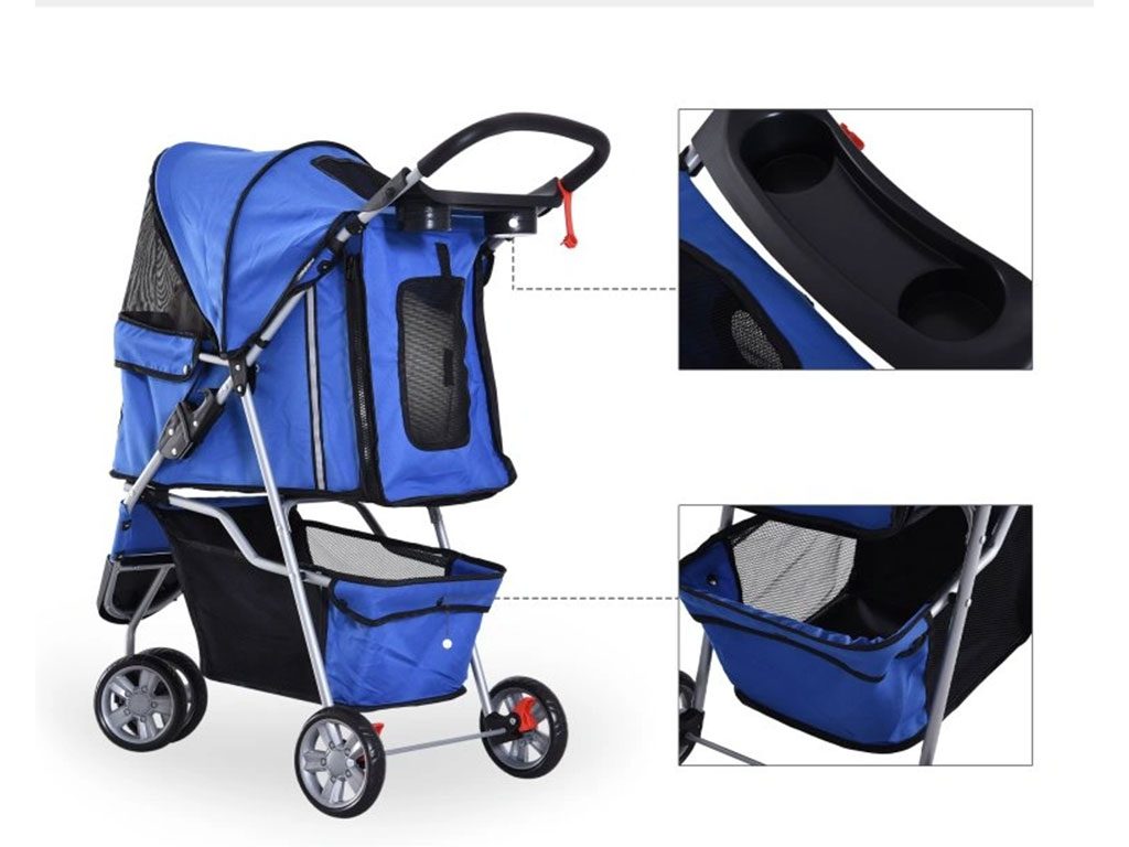 Kočárek pro psy do 10kg, 2 držáky na flašky, ocelový rám, potah z tkaniny Oxford, sklápěcí střecha proti slunci, přední síťovaná dvířka na zip, zadní dvířka s taškou na zip, uvnitř 2 bezpečnostní vodítka, dvojitá otáčecí přední kola, 2 dvojitá pevná zadní kola s brzdami, vnitřní rozměry s baldachýnem 55x32x52cm, celkové rozměry kočárku 75x45x97cm.