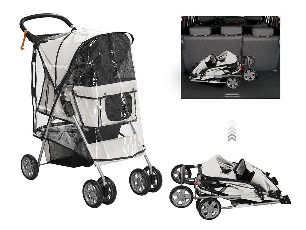 Se sklápěcí střechou proti slunci lze psa v kočárku snadno uzavřít a díky velkému síťovanému oknu v stříšce a síťovaným dvířkám má pes nejenom dobrý výhled, ale také přísun čerstvého vzduchu. Manipulace se psem bude přes přední a zadní rozepínací dvířka na zip snadná a psa následně můžete připnout na dvě bezpečnostní vodítka uvnitř kočárku. Kočárek má také dostatek úložného prostoru na výbavu pro psa. Spodní velká kapsa pod korbou kočárku slouží k uložení větších potřeb jako je láhev s vodou, vodítko, deka a další potřeby pro psy. Praktická kapsa na zip na zadních dvířkách je umístěná hned po ruce pro drobné potřeby jako jsou pamlsky, nebo doklady.