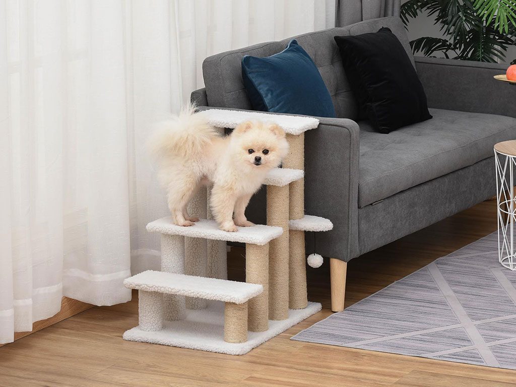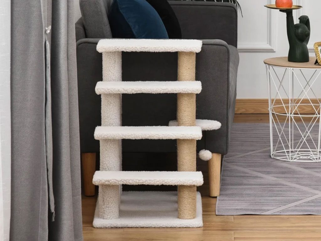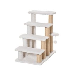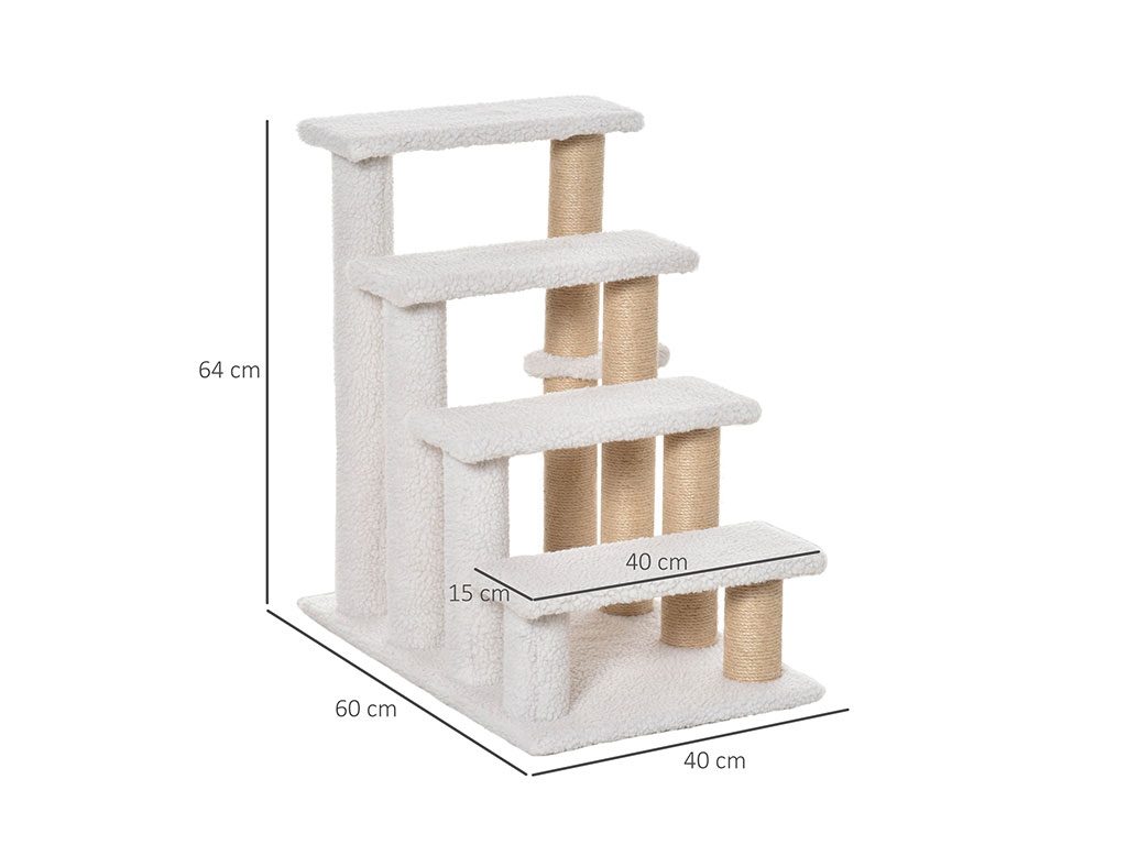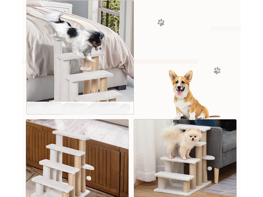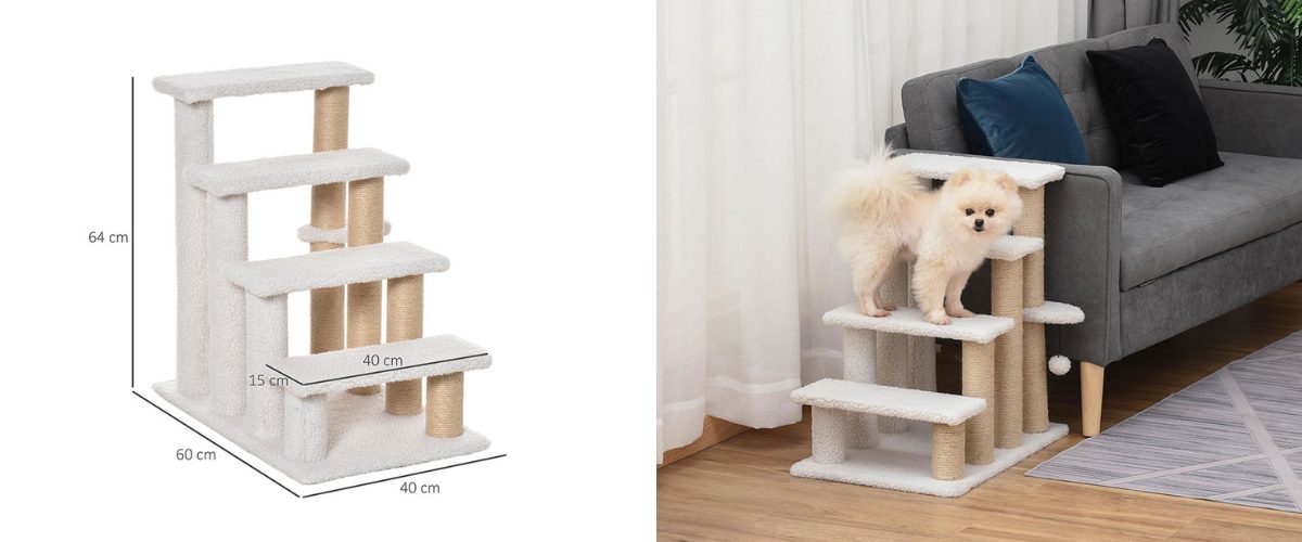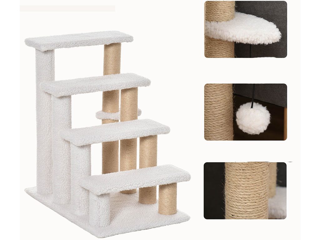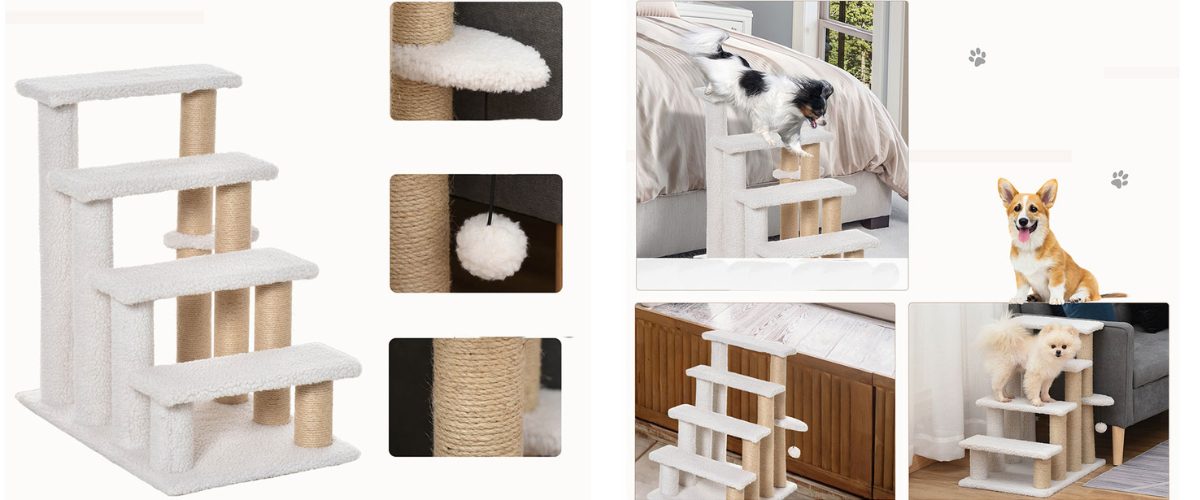 Schůdky pro psy a kočky, čtyřstupňové, pro snadné lezení, podšité měkkým plyšem, s odolným škrabadlem, s měkkým míčkem, rozměry schodu 40x15 cm, celkové rozměry 60x40x64 cm.
