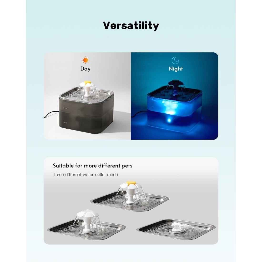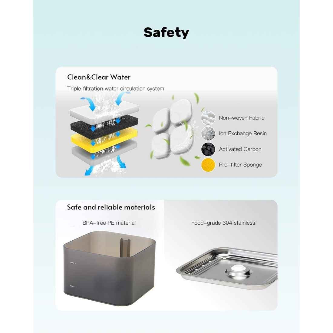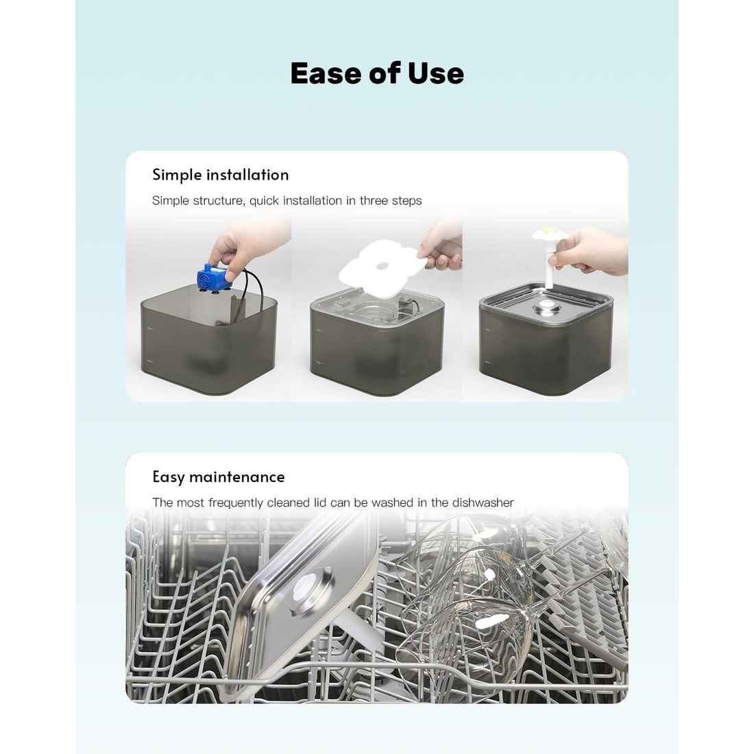 Fontána je tak vhodná pro kočky i psy malé, střední i velké velikosti. Fontána se snadno čistí, její misku z nerezové oceli můžete mýt v myčce na nádobí. Materiál je bez BPA, a je proto bezpečný a netoxický.