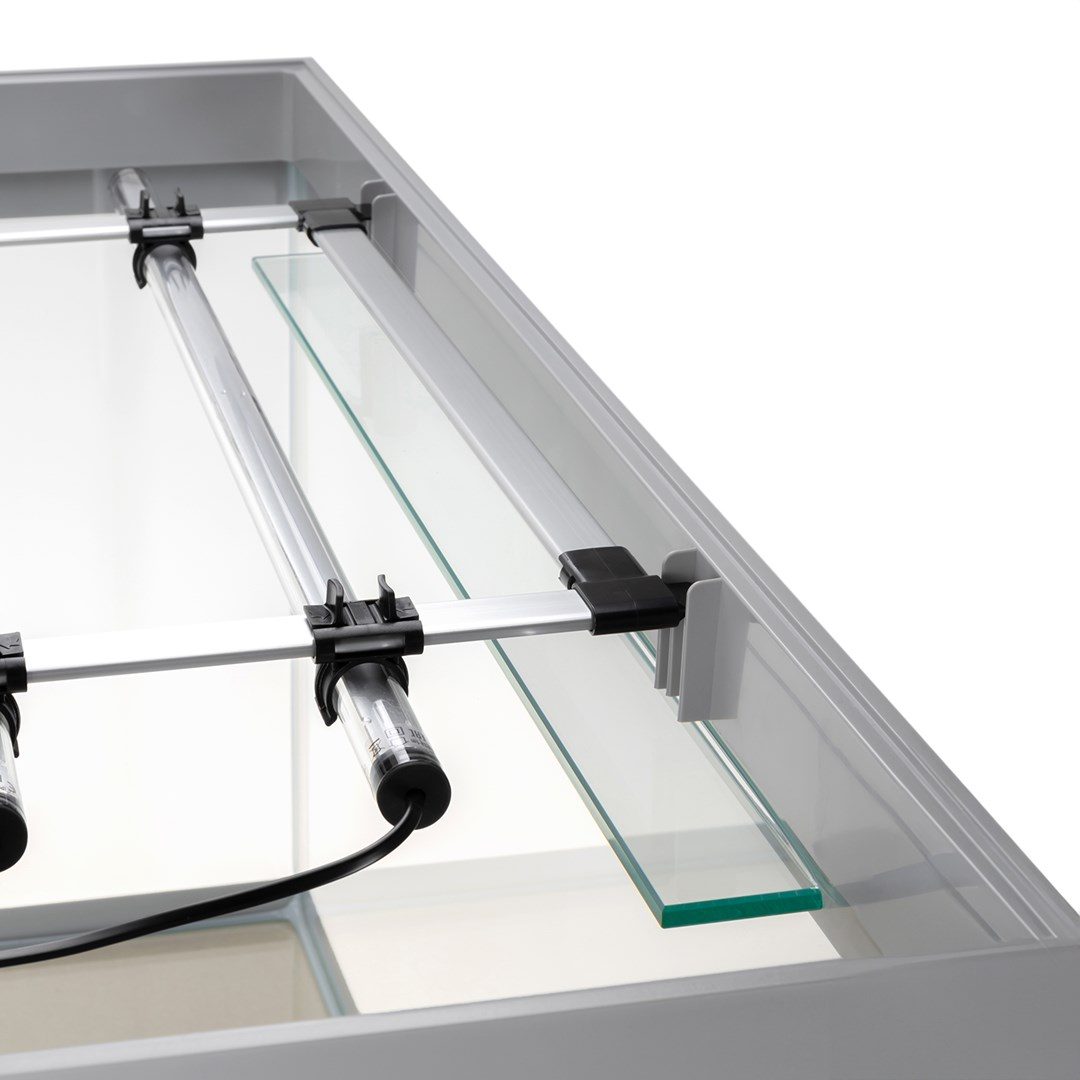 Těsně pod krytem uvnitř nádrže se nacházejí dvě lišty, na kterých je umístěno led osvětlení Aquael Leddy Tube Sunny Day & Night 2.0 s výkonem 14 W nebo 17 W. V akváriu je umístěno osvětlení s výkonem 14 W nebo 17 W, které je součástí akvária.