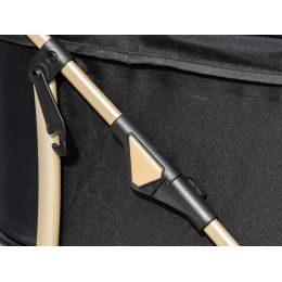Se 4stupňovou sklápěcí střechou lze psa v kočárku snadno uzavřít a díky síťované přední a zadní straně stříšky má pes nejenom dobrý výhled, ale také přísun čerstvého vzduchu. Stříšku jednoduše zajistíte zapínáním, aby pes nemohl vyskočit a navíc psa můžete připnout na dvě bezpečnostní vodítka uvnitř kočárku. Polstrované dno kočárku nabízí psovi pohodlné ležení během jízdy. Během ležení může pes pozorovat okolí přes síťovaná přední dvířka na zip, která lze otevřít. Kočárek má také dostatek úložného prostoru na výbavu pro psa. Spodní velká kapsa pod korbou kočárku slouží k uložení větších potřeb jako je láhev s vodou, vodítko, deka a další potřeby pro psy.