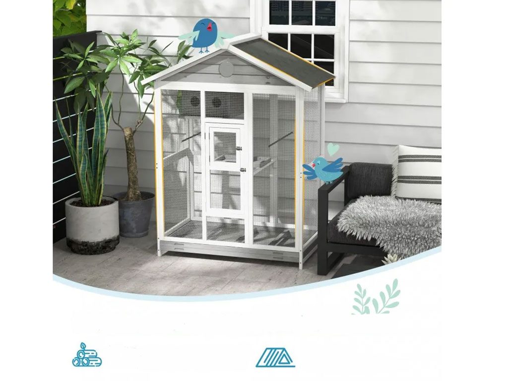 Voliéra pro ptáky ze dřeva, jedlové dřevo a pletivo, výsuvný trusník, asfaltová střecha, 2 uzamykatelná dvířka, 4 bidýlka a 1 hnízdo, stylová bílá barva, rozměry 112x68x154cm.