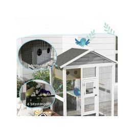 Voliéra z jedlového dřeva, bílé provedení, je vhodná pro ptactvo, výsuvný trusník, 2 uzamykatelné dvířka, rozměry 112x68x154cm. Pokud hledáte bezpečnou voliéru ze dřeva pro Vaše opeřence, kterou lze umístit do interiéru i ven, pak Vás určitě potěšíme. Voděodolná asfaltová střecha a plášť poskytují výbornou odolnost, což činí tuto klec vhodnou pro venkovní použití. Tato ptačí klec je vybavena 4 bidýlky, hnízdem pro chov a spoustou možností pro ptáky, aby se mohli bavit. Uživatele jistě potěší snadný přístup, který zajišťují dvoje dveře – velké (28 x 60 cm) a malé (21 x 25 cm), jež umožňují rychlé a pohodlné doplnění potravy a vody. Do klece lze umístit desku, na kterou můžete položit krmivo nebo materiál na hnízdění. Čištění je velmi pohodlné díky výsuvnému trusníku s pletivem, které brání ptákům opustit klec během údržby.