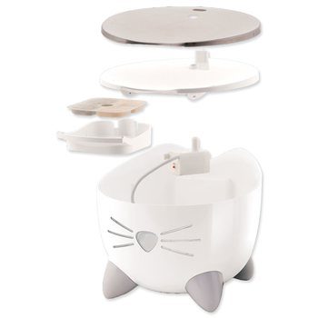 Filtr, který je součástí balení, odstraňuje z pitné vody pachy a i ty nejmenší nečistoty. Navíc vodu změkčuje, protože snižuje množství vápníku a hořčíku, které obsahuje. Stačí nasadit hlavici trysky pro obloukovitý proud vody. Vaše kočka může pít, i když je fontána vypnutá. Je vybavena nočním světlem, tichým čerpadlem, LED indikátorem stavu a funkcí automatického vypnutí. Filtry se prodávají samostatně. Podrobnosti o produktu: S vložkou z nerezové oceli. USB přípojka 5 V DC, 1 A. Adaptér < 1 W. Velmi tiché a plně odnímatelné čerpadlo. Trojnásobný filtr. Automatické vypínání. Signalizace nízké hladiny vody. Rozměry (d × š × v) cca 20,5 × 20,5 × 17 cm. Funkce světelného ukazatele v čumáčku: Bílá barva znamená noční světlo. Červené blikání znamená, že je třeba doplnit vodu. Červená barva znamená, že došla voda. Automatické vypínání.