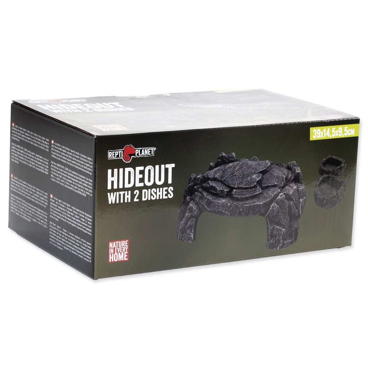 Kombinace úkrytu, vyvýšeného místa pro pozorování či výhřev a dvou misek, které můžeme použít na vodu či krmení. ? Jedinečná kombinace úkrytu, rozhledny a misek pro krmení či vodu.? Misky lze umístit samostatně v prostoru terária nebo na bocích jeskyně (jsou opatřeny magnety). Přírodní design a dostatečně velké rozměry zajistí menším i středně velkým plazům a obojživelníkům ideální úkryt, který je důležitý nejen pro odpočinek, ale i pro ochlazení. Design vhodný obzvláště k tmavým pískům a substrátům. Rozměry 39 x 14,5 x 9,5 cm