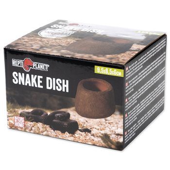 Miska na vodu pro plazy s designem vhodným obzvláště pro hady. Široká základna a váha misky zabraňuje převržení zvířetem. Zároveň se do ní díky velkému objemu vejde hodně vody. Vnitřní plocha je stříkaná, tím pádem minimalizuje tvorbu bakterií, velice dobře se čistí, neulpívají na ní nečistoty, a tak se i snadno dezinfikuje. Vnější plocha má hrubý vzor, který je hadům nápomocný při obměně vnější části pokožky, kdy se mohou o misku třít, a tím snadněji svléknout starou kůži. Některé menší druhy hadů, anebo mláďata se ráda do misky choulí, obzvláště pak v letních měsících, kdy jim voda poslouží k ochlazení. Vyrobeno z ekologického pryskyřicového materiálu. Rozměry 9,5 x 8,5 x 6 cm