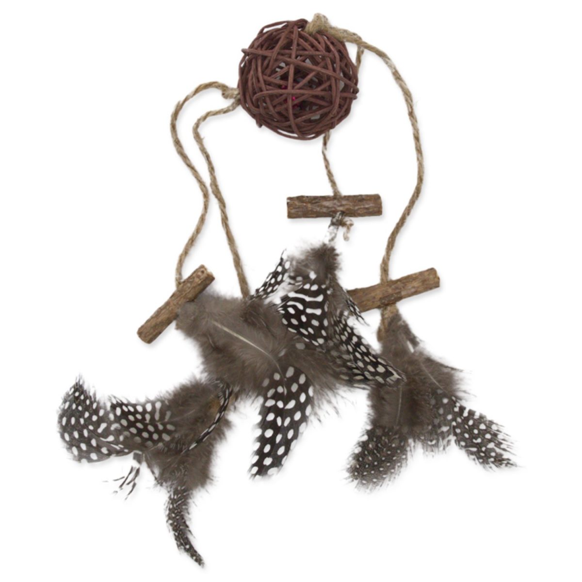 Ústředním prvkem je ratanová koule s rolničkou uvnitř, která při každém pohybu vydává jemný zvuk a vzbudí tak zájem vaší kočky. Z míče vycházejí čtyři šňůrky zakončené dřevem matatabi a peřím, díky nimž je hračka ještě atraktivnější a stimulující. Díky přírodním materiálům, jako je dřevo, peří a ratan, je hračka nejen bezpečná, ale také odolná a přátelská ke kočkám. Je to ideální způsob, jak stimulovat lovecké instinkty vašeho mazlíčka a zároveň mu poskytnout aktivní a poutavou hru. Výrobek obsahuje malé nebo pohyblivé části, které by mohly být nebezpečné.